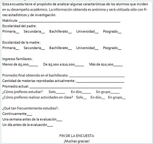 La información de la aprobación y reprobación de los estudiantes participantes en este estudio fue proporcionada por los docentes del curso. Los demás datos fueron recopilados por medio de una encuesta, la cual estuvo formada por una hoja tamaño carta en la que se especifica el propósito y los datos a recabar. De manera oral, se indicó a los participantes que la información recabada tiene fines estadísticos y de investigación. En la Figura 2 se muestra el formato del instrumento utilizado para recabar la información.