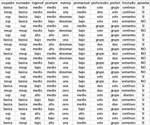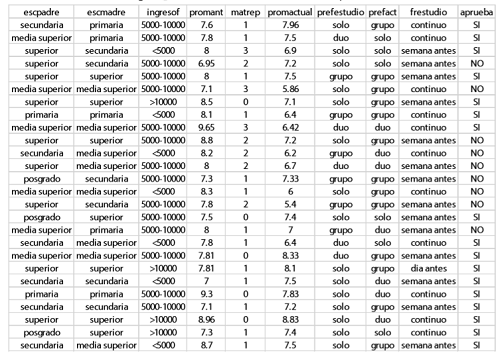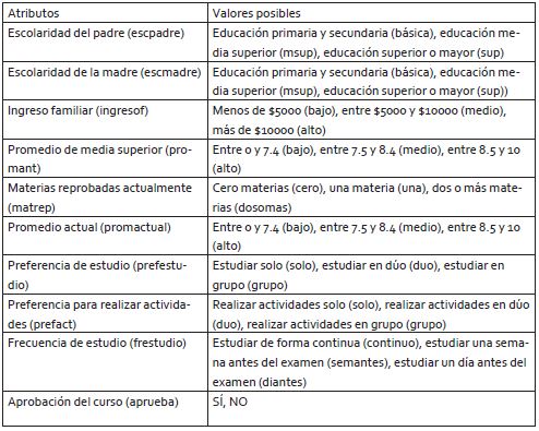 La muestra de datos corresponde a estudiantes inscritos en una carrera de ingeniería perteneciente al Instituto Politécnico Nacional en la Ciudad de México. Los datos recopilados fueron la aprobación y reprobación de los estudiantes en un curso de matemáticas. También se recopilaron datos personales y escolares que han sido utilizados en la literatura para la predicción del rendimiento académico, tales como ingreso familiar, escolaridad del padre, entre otros (Shahiri et al., 2015). En total participaron 122 estudiantes en este estudio. En Kotsiantis et al. (2003), y Mueen, Zafar y Manzoor (2016), se ha observado que, con cantidades similares, el algoritmo Naïve Bayes ha obtenido una exactitud mayor en comparación con otras técnicas de minería de datos.