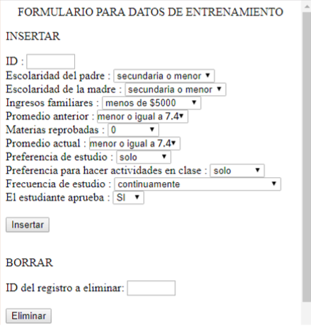 En este trabajo, la tarea predictiva empleada es la clasificación, y la técnica utilizada es el algoritmo Naïve Bayes. El modelo predictivo se construye por medio del cálculo de las probabilidades a priori y a posteriori, descrito en las secciones anteriores. Por ejemplo, el número de registros en donde el atributo “aprueba” es igual a “SÍ” es de 65 de 122 posibles, por lo que la probabilidad a priori P(aprueba=SÍ) es igual a 65/122 = 0.5328. Otro ejemplo, es el número de registros en donde el atributo “escpadre” es igual a “básica” dado que “aprueba” es igual a “SÍ”, tomando en cuenta la ley de sucesión de Laplace, es de 28 de 68 posibles; de esta manera, la probabilidad a posteriori P(escpadre=basica/aprueba=SÍ) es igual a 0.4118. La estimación de este tipo de probabilidades es laboriosa debido a la cantidad de datos a analizar, por lo que existen diferentes herramientas informáticas que permiten aplicar técnicas de minería de datos para crear modelos predictivos, tal y como se ha hecho en Jaramillo y Paz (2015), y Pacheco y Fernández (2015). No obstante, este tipo de herramientas requieren que los usuarios tengan conocimientos especializados, tanto en el uso de la herramienta como en minería de datos. Por lo que, a diferencia de estos trabajos y de manera similar a Valero, Salvador y García, (2010), en este trabajo se realizó una plataforma en la que se programó el algoritmo Naïve Bayes en HTML5 (HyperText Markup Language, versión 5) y PHP (Hypertext Pre-Processor) con el propósito de publicarlo en un sitio web como un apoyo a profesores, no solo de la institución donde fueron recabados los datos sino de cualquier institución educativa. Esta plataforma permite introducir datos de entrenamiento de un número variable de estudiantes y de cualquier área de estudios para calcular automáticamente las probabilidades a priori y a posteriori. La interfaz gráfica para introducir los datos de entrenamiento se muestra en la Figura 4.