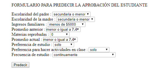 Una vez construido el modelo, se puede predecir la aprobación de un nuevo estudiante a partir de las probabilidades de la Tabla 2 que correspondan a los atributos de dicho estudiante y aplicando la fórmula 3. Esto se puede hacer de forma automática por medio de la plataforma construida, ya que permite calcular la predicción de un nuevo registro, una vez estimadas las probabilidades del modelo. La interfaz gráfica para introducir los datos de prueba se muestra en la Figura 5.