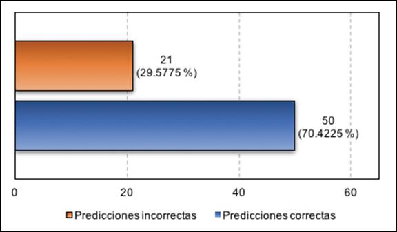 Para comprobar la exactitud estimada del modelo predictivo construido, se aplicó el modelo para predecir el rendimiento académico de 71 estudiantes del mismo curso, pero del siguiente semestre. Primeramente, se utilizó el modelo predictivo construido y la plataforma realizada para obtener predicciones de los estudiantes. Posteriormente, se compararon estas predicciones con los resultados reales obtenidos por los estudiantes al final del curso. En la Figura 6 se presenta el número de predicciones correctas e incorrectas. Además, se observa que la exactitud de las predicciones fue de 70.4225 %, la cual es superior a la estimada con el método de validación cruzada.