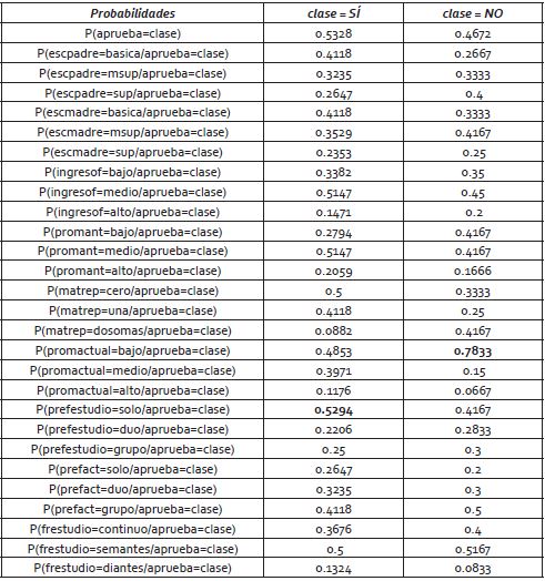 Por medio de esta plataforma se obtuvieron todas las probabilidades a priori y a posteriori que componen el modelo predictivo, las cuales se presentan en la Tabla 2.