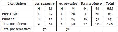 Como se puede observar, hay una mayor cantidad de participantes del género femenino. En la Licenciatura en Educación Preescolar es donde más mujeres hay (60 en total). Sin embargo, en primaria se observa una relación aproximada de 3 mujeres por cada hombre. En total, la relación de participantes es de 6.5 mujeres por cada hombre.