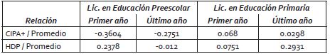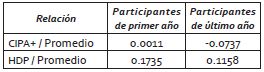 En la Tabla 10 se pueden observar los resultados para las relaciones del CIPA+ con el promedio de los participantes, así como para el test de HDP y el promedio. El análisis de los resultados se hizo en dos partes, uno para los participantes de primer año y otro para los de último año. La razón de presentarlo así es que se usaron promedios de diferente clase para la correlación. Para los participantes de primer año se usaron los promedios de egreso de bachillerato, entendidos como los promedios de ingreso. Mientras que para los estudiantes de último año se usaron los promedios generales acumulados durante la carrera.