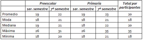 El número de participantes fue de 26 en educación preescolar de último año, todas mujeres, 32 en educación primaria de último año, siendo 8 hombres y 24 mujeres, 35 en educación preescolar de primer año, siendo 1 hombre y 34 mujeres, y 35 en educación primaria de primer año, siendo 8 hombres y 27 mujeres. La totalidad de participantes fue de 128 estudiantes, de los cuales 111 eran mujeres y 17 hombres, cuyas edades van de los 18 a los 35 años.