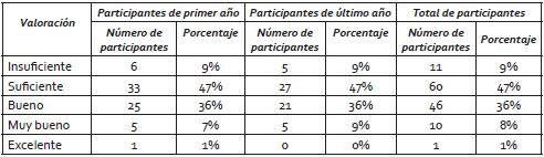 Se puede ver que hay una paridad entre los estudiantes de primero y último año en los resultados generales del test. En cuanto al porcentaje de alumnos por muestra, en las valoraciones de insuficiente, suficiente y bueno, los resultados son similares. Sin embargo, en las valoraciones “muy bueno” y “excelente” hay una diferencia mínima, destacando el hecho de que el único resultado con valoración de “excelente” fue obtenido por un alumno de primer año.