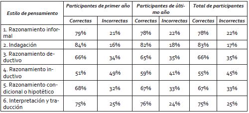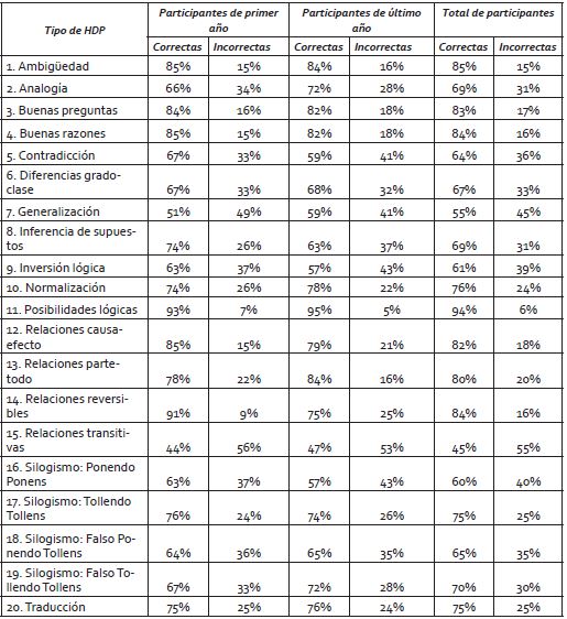 Se puede observar que en las habilidades de “generalización” y “relaciones transitivas” menos de 60% de los participantes de primer año contestaron correctamente. Mientras que las habilidades en las que menos de 60% de los participantes de último año obtuvieron respuestas correctas fueron las de “contradicción”, “generalización”, “inversión lógica”, “relaciones transitivas”, “silogismo: ponendo ponens”. Esto sugiere que, en términos generales, los participantes del primer año tienen un desarrollo mayor de las HDP que sus compañeros de último año. Esto puede predecir un mejor rendimiento académico durante su carrera de los participantes de primer año que el obtenido por los estudiantes de último año (Arons, 1979; Whimbey y Lochhead, 1986; Montealegre, 1992; Raths et. al., 1997; Reyes, 2004, citados por Navarro, 2004).