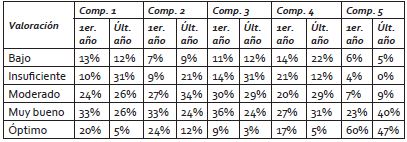 En estos resultados se destacan los porcentajes del componente 5: interdependencia y valor social. Como se recuerda, este es el componente que se añadió al CIPA original. Como se puede observar, hay un número mayor de participantes de primer año (60%) con un resultado “óptimo” en el componente mencionado, en comparación con los de último año (solo 47%). Esto puede sugerir una mayor conciencia del uso de la tecnología para fines académicos por parte de los participantes de primer año.