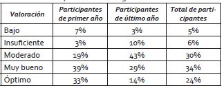 Como se puede observar, el número de participantes de primer año con resultados de valoración “óptimo” en el perfil autodirigido es mayor (33%) al del número de participantes de último año (14%) con la misma valoración. Además, el mayor número de participantes de último año se coloca en la valoración “moderado” del perfil autodirigido (43%). Mientras que el mayor número de participantes de primer año se coloca en la valoración “muy bueno” del perfil autodirigido (39%).
