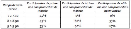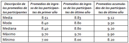 Para dar cuenta del desempeño académico de los participantes, se usaron los promedios generales de ingreso a la licenciatura para los participantes de primer año y los promedios acumulados de los semestres para los participantes de último año. También se consideraron los promedios de ingreso de los participantes de último año, solo como referencia. En la tabla siguiente se pueden ver las tendencias de los promedios de los participantes.