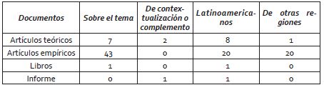 A continuación, se presenta una síntesis cuantitativa de los textos seleccionados para este artículo, donde se contabiliza un total de 18 textos recuperados; de ellos, tres fueron considerados para contextualizar y complementar el análisis (Tabla 2).