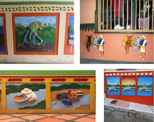 Los contenidos y las formas de los zócalos representan claramente tramos de la historia y la evolución del municipio en relación con su cultura, economía, características ancestrales y transformaciones sociales y políticas. Algunas de sus imágenes recrean actividades económicas importantes para el lugar, como la ganadería, agricultura, arriería, minería y extracción de material de playa, el comercio y el turismo (ver la Imagen 3).