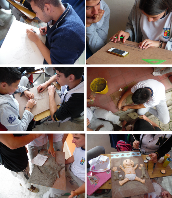 Frente al interés que mostraron los estudiantes por el conocimiento de los zócalos, Nigdan Suárez, uno de los zocaleros del municipio, presentó la propuesta de desarrollar talleres con los estudiantes del décimo primer grado de la institución, en lo relacionado con la identidad, diseño y construcción de zócalos. Estos talleres fueron liderados por el profesor Efraín Bonilla en el área de educación artística, de forma trasversal, con el área de ciencias sociales. Los estudiantes realizaron bocetos y construyeron zócalos de acuerdo a lo aprendido (ver la Imagen 8).