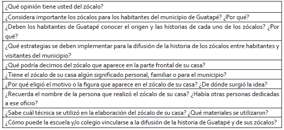 Con el objetivo de indagar sobre el origen y las historias de los zócalos del municipio de Guatapé y su significado particular, se aplicaron entrevistas en las que intervinieron diferentes actores de la comunidad: docentes, propietarios de las viviendas donde aparecen los zócalos, líderes comunitarios, comerciantes, albañiles, estudiantes y turistas (ver Cuadro 1).