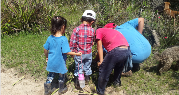 En el año 2017 obtuve una beca doctoral, y a partir de ese momento mis visitas a la escuela ya no tuvieron que ver exclusivamente con las tareas de dicho proyecto. Desde ese año participo de varias situaciones, tanto en la escuela como en la comunidad; la observación participante y las conversaciones son las herramientas fundamentales de producción de la información. Los niños y niñas de este paraje se convirtieron no solo en interlocutores centrales respecto a estos temas sino, también, en compañeros de equipo de investigación con quienes compartimos espacios de producción y discusión respecto a diversas áreas de indagación, algunas propuestas por mí y otras por la escuela.