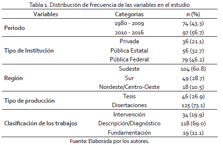 Los resultados evidenciaron que la mayoría de las investigaciones fue publicada entre 2010 y 2016 (56.7%); vinculadas a instituciones públicas federales (46.2%); producidas en la región Sudeste (60.8%); disertaciones (73.1%); clasificada como descriptivas/diagnóstico (69.0%) (Tabla 1).