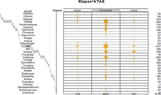 En primer lugar, se llevó a cabo un análisis descriptivo mediante porcentajes para determinar la presencia de las distintas acciones (ATA, estructuras, ayudas, colaboraciones) en las fases en que se dividió la clase. Se acompañó ese análisis descriptivo con una caracterización gráfica comparativa para determinar la presencia de posibles asociaciones entre acciones y elementos.
