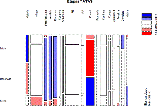 El gráfico muestra barras cruzadas entre etapas (eje Y) y ATA, Estructura y Ayudas (eje X), que representan su mayor o menor frecuencia al cruzar ambas categorías. Así, por ejemplo, al considerar Método, esta aparece con la misma relevancia durante la etapa de Inicio y Desarrollo, bastante menor en cierre. El color, cuando es azul, indica una frecuencia sobre la esperada, mientras que el color rojo refleja una frecuencia debajo de la esperada. En el caso de Método, su frecuencia es relevante en las etapas mencionadas, sobre lo esperado en el Inicio y bajo lo esperado en Desarrollo. Con esta norma, la lectura de las restantes categorías cruzadas es simple. Presentación del Problema, Análisis y Ejecución denotan una presencia arriba de la esperada en el desarrollo de la clase y debajo de lo esperado en inicio y cierre. Control se presenta abajo de lo esperado en inicio y desarrollo, pero sobre lo esperado en cierre. Y Completa, así como Motiva, están encima de lo esperado en inicio y cierre, respectivamente.