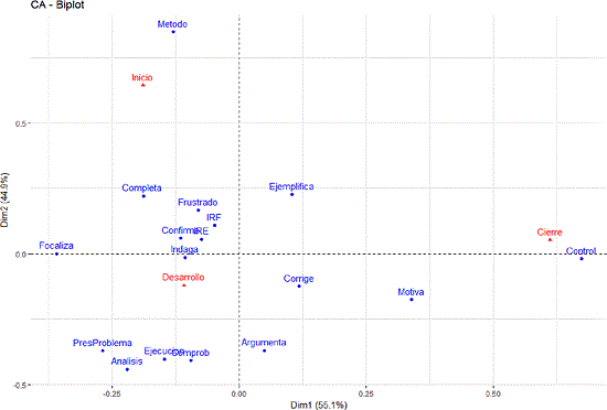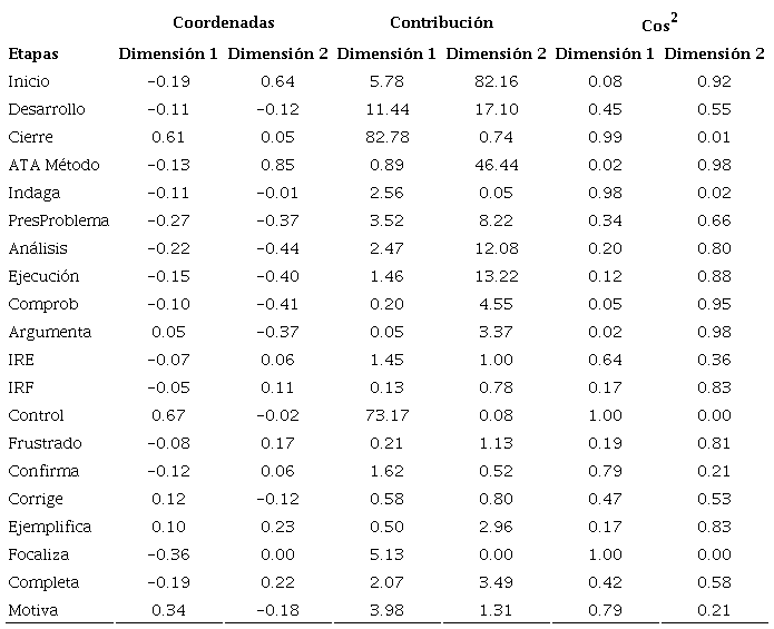 Existe una cierta concordancia entre categorías con mayores valores en coordenadas, su porcentaje de contribución y su calidad de representación. Así, entre las etapas de la clase, la dimensión 2 representa mejor el inicio y el desarrollo, mientras que la dimensión 1 lo hace mejor con la etapa de cierre. Entre las acciones, las mejor representadas y que más contribuyen a la dimensión 2 son Método, Análisis y Ejecución. En la dimensión 1 contribuyen más las acciones Control y Figurando, pero en mucho menor medida, la acción Focaliza.