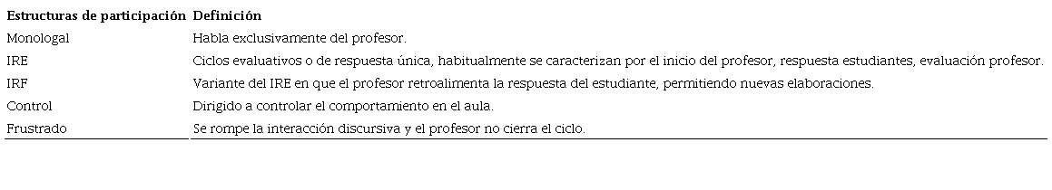 Desde esta perspectiva, cobra sentido el análisis de las discusiones dialógicas que se dan en las clases. Es así como Cazden (1988) se refiere a la estructura conocida como Iniciación-Respuesta-Evaluación, enfocándose en el tiempo en el que se discute y se desarrollan ideas cuando la interacción se dé en este formato I-R-E, de manera que los estudiantes desarrollan procesos cognitivos elevados que les permiten una mayor comprensión y, con ello, mayores posibilidades de aprendizajes significativos (Copeland, 2004). Lo anterior tiene lugar en la Actividad Típica de Aula (ATA), definida por García, Rosales y Sánchez (2010) como “cada una de las actividades que integran una sesión de clase, como la explicación, la lectura colectiva, la resolución de problemas matemáticos, etc. De esta manera, se puede decir que cada una de las sesiones de una unidad didáctica está compuesta por diferentes ATA” (García, Rosales y Sánchez, 2010: 366).