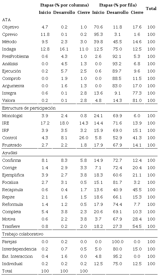 El primer paso en el proceso de análisis fue obtener una representación porcentual de la presencia de las actividades típicas de aula (ATA), estructuras de participación, ayudas pedagógicas y formas de trabajo colaborativo por cada una de las etapas en las que se dividió la clase. Son 30 acciones por cada una de las 23 clases que eventualmente podrían aparecer en cualquiera de las etapas. La Tabla 5 dispone los resultados porcentuales por columna y posteriormente, por fila.