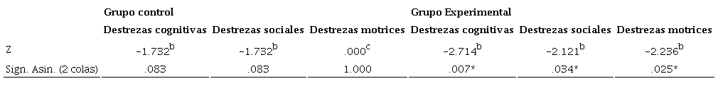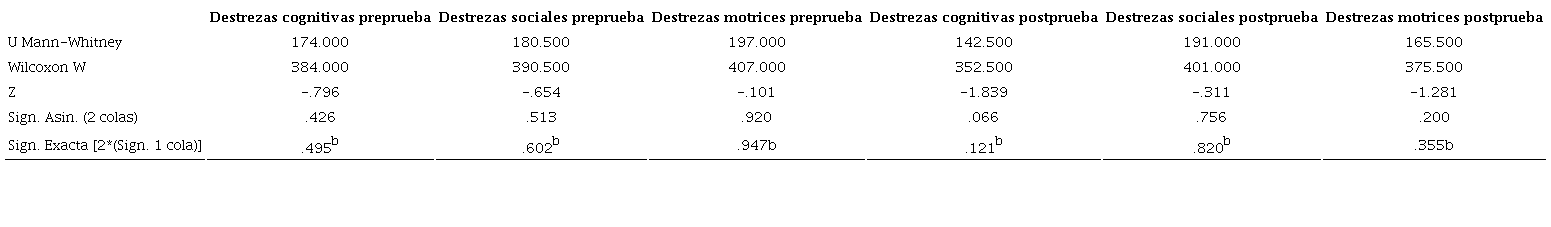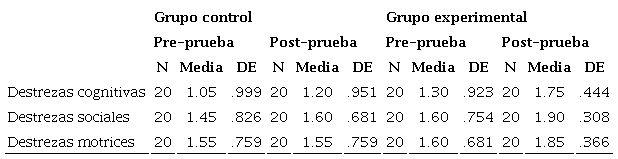 Estadísticas descriptivas. Se obtuvieron estadísticas descriptivas para mostrar las medias y las desviaciones estándar del grupo control y del experimental (Tabla 1), que revelaron que las medias pre-prueba en ambos grupos eran similares antes de la intervención. Los dos grupos de calificaciones de los niños fueron evaluados con una prueba U de Mann-Whitney (Tabla 2) en términos de equivalencia antes de la intervención, ya que esta prueba ha sido descrita como apropiada para su uso con muestras pequeñas (Curtis y Marascuilo, 2004). La suma de los rangos para cada grupo se calcula y luego se compara con la del otro grupo. Un valor p significativo (p < .05) indica una diferencia significativa entre los dos grupos. El grupo experimental y el de control no difirieron en destrezas cognitivas (M= 1.30, DE= .923; M= 1.05, DE= .999), sociales (M = 1.60, DE= .754; M=1.45, DE= .826), y motrices (M = 1.60, DE= .681; M= 1.55, DE= .759), respectivamente, p > 05. Por lo tanto, ambos grupos eran similares en estas destrezas antes de la intervención, lo cual sugiere que los participantes compartían un desarrollo similar de sus destrezas cognitivas, sociales y motrices.