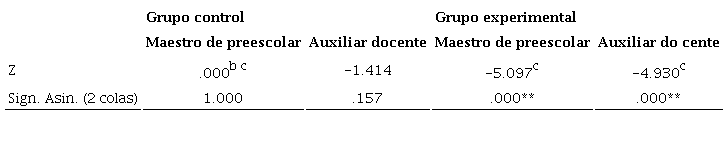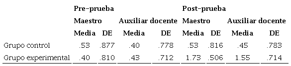 Se pidió a los maestros de preescolar y a los ADs que calificaran el uso de las prácticas de transición como preparación para la transición a primer grado con base en una escala tipo Likert de tres puntos con 40 ítems. Las estadísticas descriptivas para los maestros y los ADs de ambos grupos se muestran en la Tabla 4. Adicionalmente, se hizo la prueba no paramétrica de suma de rangos Wilcoxon para analizar las diferencias en las calificaciones medias después del período de intervención en ambos grupos (Tabla 5). Los resultados mostraron diferencias estadísticamente significativas entre la pre-prueba y la post-prueba en el grupo experimental; maestro (M= 1.73, DE= .506) W= .000, p< .001; auxiliar docente (M= 1.55, DE= .714) W= .000, p< .001, pero no en el grupo control; maestro (M= .53, SD=.877) W= 1.000, p= .05; auxiliar docente (M=.40, DE=.778) W=.157, p= .05 respectivamente. Estos resultados sugieren que el maestro de preescolar y el auxiliar docente del grupo experimental reportaron un uso más frecuente de prácticas de transición que fomentan las destrezas relacionadas con la alfabetización en los niños.