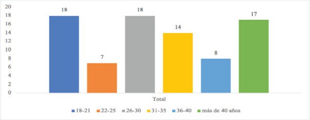 Lo primero que hay que señalar es que del total de la muestra, 62 fueron mujeres (76%) y 20 varones (24%), cuyas edades van desde 18 a más de 40 años; de estas: 18 personas se encuentran en el rango de 18-21 años, siete entre 22-25 años, 18 de 26-30 años, 14 entre 31-35 años, 8 de 36-40 años y 17 con más de 40 años (Figura 1).