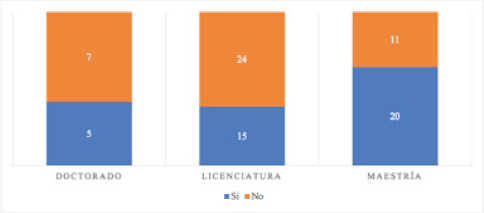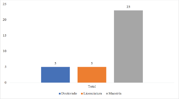 De los 33 estudiantes docentes frente a grupo, 23 están cursando la maestría, cinco el doctorado y otros cinco la licenciatura (Figura 5). Respecto a su género, 22 son mujeres y 11 varones.