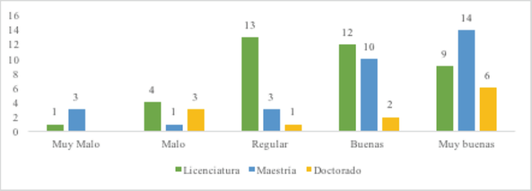 En cuanto al desarrollo de las actividades académicas durante la emergencia sanitaria, de las 82 personas que conformaron la muestra, 29 mencionaron que las desarrollaron muy bien, 24 bien, 17 regular, 8 mal y 4 muy mal (Figura 11).