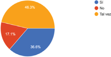 Lo anterior contrasta un poco con la opinión de los propios estudiantes respecto a su percepción sobre si los docentes de la UPV recibieron capacitación para la planeación y desarrollo de sus actividades académicas de forma virtual, pues existe un alto grado de incertidumbre; 38 personas refirieron que tal vez, 14 que no y 30 que sí (Figura 12).
