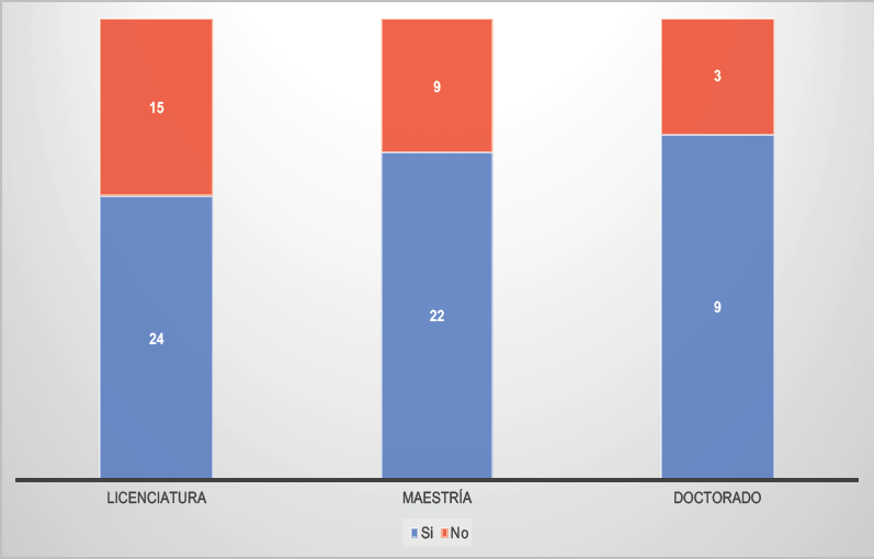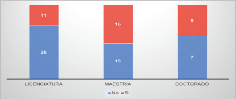 Pasando a una dimensión institucional, es decir, lo que la propia UPV ofreció al momento de la emergencia sanitaria, las referencias al señalamiento de una plataforma institucional para el desarrollo de las actividades académicas están divididas: 49% mencionó que no lo hubo, mientras que 51% que sí; la mayoría de las respuestas afirmativas provienen de estudiantes del nivel de maestría (Figura 10).