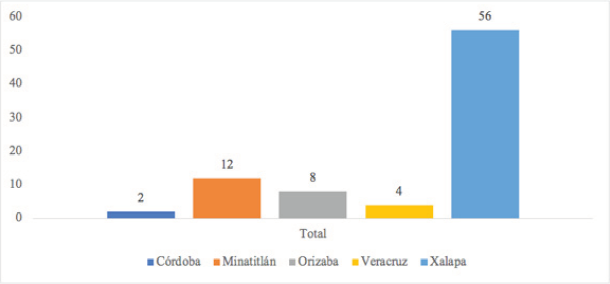 En cuanto al CRE en el que se encuentran, los datos arrojaron que 56 estudiantes se ubican en Xalapa, 12 en Minatitlán, ocho en Orizaba, cuatro en Veracruz y dos en Córdoba (Figura 2); los cuales son procedentes de 29 municipios del estado de Veracruz, ubicados en distintas zonas escolares.
