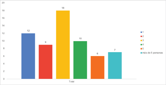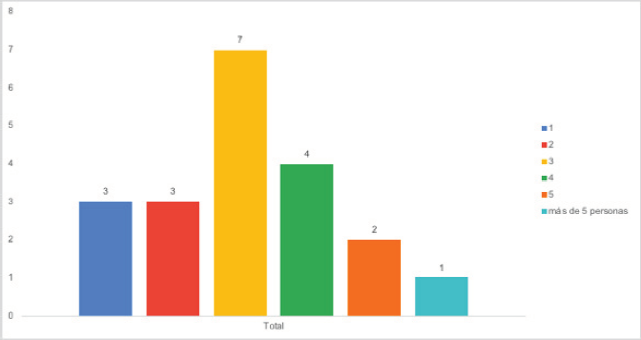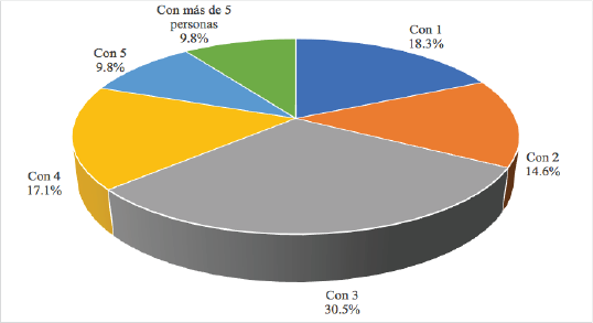 Respecto a cómo están pasando la emergencia sanitaria (quédate en casa), 89% lo hace en su residencia habitual y 11% en otra residencia; de los 82 estudiantes de la muestra, 25 personas viven con tres personas más, 15 con una persona, 14 con cuatro, 12 con dos, 8 con cinco y otras 8 con más de cinco personas (Figura 6).