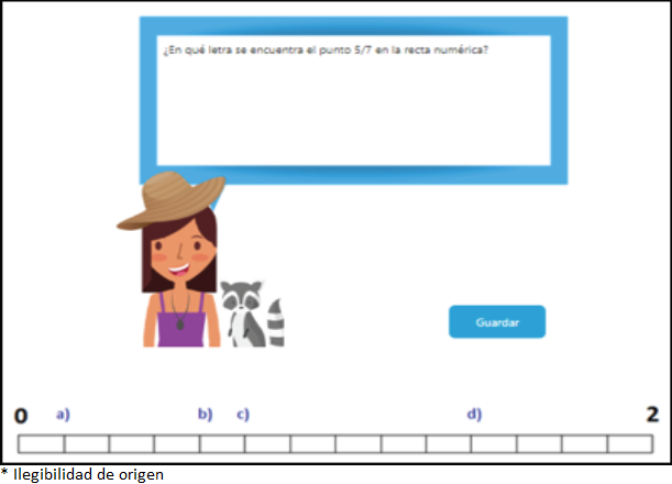 En el ejemplo anterior se muestra el problema número 126, correspondiente al subconstructo fracción como medida (Kieren, Behr, 1976 en Charalambous, Pitta-Pantazi, 2007), clasificado como un ejercicio de nivel 4 (en el nivel 1 se encuentran los problemas más sencillos, y conforme se avanza en la resolución de los mismos se complejizan hasta llegar al nivel 4, el más complejo con que cuenta la aplicación), cuyo propósito es identificar en una recta numérica una fracción dada, de la que solo se tienen los referentes de inicio (el punto 0) y fin de la recta (el punto 2), sin mencionar a cuánto equivalen cada una de las subdivisiones, no incluyendo pistas respecto de esta información, solo el número de marcas en que se divide la recta.