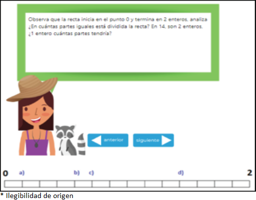 Mediante este mensaje se busca centrar a los estudiantes en la importancia de identificar las cantidades del punto inicial y el punto final de la recta numérica. Enseguida, analizar en cuántas partes está dividida la misma. En este caso se pone énfasis en que inicia en un entero y termina en el punto 2 enteros. Además, tiene la finalidad de corroborar el número total de veces en que está dividida la recta, así como aclarar que esas divisiones son para dos enteros, y que habrá que considerar en cuántas partes está dividido uno de ellos. Por esta razón se lanza la siguiente pregunta al estudiante: ¿Un entero cuántas partes tendrá?