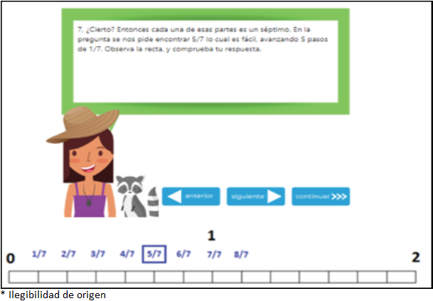 La segunda parte de la retroalimentación se da mediante un diagrama y el texto que brinda respuesta a la pregunta hecha en el mensaje anterior, asimismo, se da a conocer que, dado que cada entero está dividido en 7 partes iguales, cada una corresponde a 1/7, y solo hay que contar 5 segmentos, partiendo de 0 para encontrar el punto 5/7, que se solicitó en el enunciado del problema.