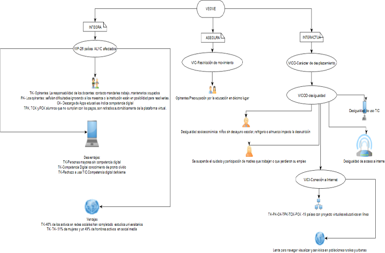 Con respecto a la pregunta ¿Qué sucede en la escuela virtual en el momento actual, tras casi una década de políticas de integración masiva de tecnologías? Sucede que el Orgware Virtual Educativo de ALyC es un sistema cuya sustantividad le permite relacionase con el entorno, de donde la integración, el aseguramiento y la interaccion le aportan energía y orden por medio de las variables que las trasmiten a los procesos. Para dar respuesta a la pregunta ¿Cómo han contribuido los desarrollos tecnológicos para continuar con el periodo escolar en la virtualidad? La estructura VEOVE-VIP-VIC-VICOD y TPAK revelan el desafío que le representa la perspectiva socioeconómica, la competencia pedagógica digital y la competencia de conexión a Internet, pues la comptencia digital por sí sola no alcanza para llevar a cabo el proceso educativo virtual, como tampoco alcanza la lentidud de la red, fallo ligado estrechamente al factor socieconómico. Finalmente ¿Qué viven, especialmente, quienes se encuentran sin conexión a Internet fuera del contexto escolar? Las narrativas reflejan incetidumbre de las personas con respecto a la modalidad virtual (Gráfico 1).