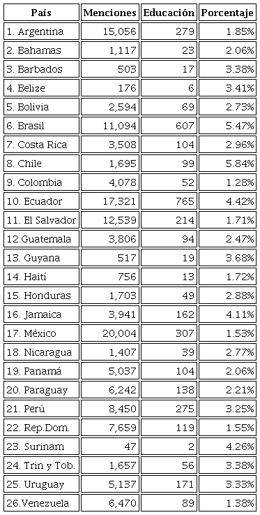 La variable permite conocer que las opiniones recuperadas de Twiter ubican la educación como motivo de preocupación en décimo lugar, es decir, entre las categorías más bajas, solo antes de noticias falsas, el teletrabajo y el medio ambiente. Para corroborarlo, a continuación se presenta la cantidad de menciones para educación por país (Tabla 3).