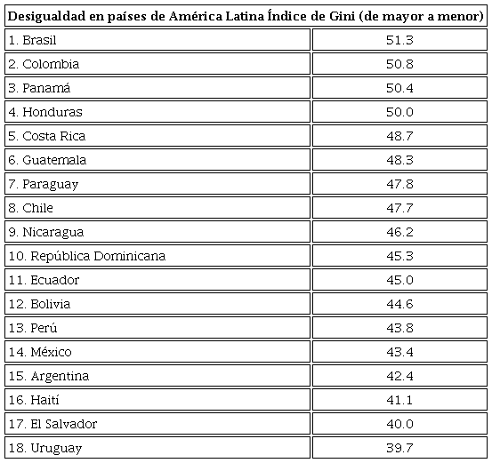 De acuerdo con el coeficiente Gini, 0 representa una equidad perfecta, mientras que un índice de 100 representa una inequidad perfecta, según el Banco Mundial. El rasgo de desigualdad en América Latina agudiza la crisis socioeconómica motivada por el confinamiento (COVID-19).