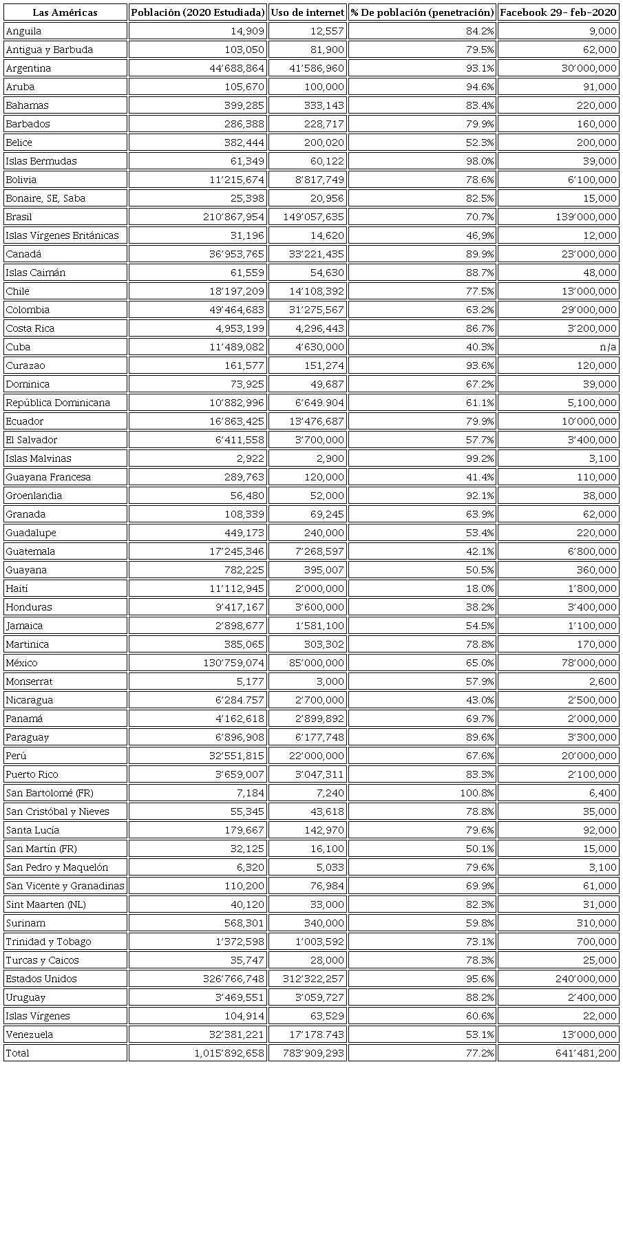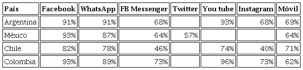 Rivoir (2019) asegura que numerosas personas con acceso a Internet lo hacen únicamente a través de celulares, sobre todo, esto ocurre en las zonas rurales. Se desconoce la gran cantidad de docentes, estudiantes y padres de familia que están dedicando las tecnologías digitales fundamentalmente al entretenimiento y la socialización por medio de las redes sociales como Facebook. En tanto, el provecho para la formación en un contexto educativo o para desarrollar habilidades útiles en la mejora académica de modo virtual, en el mejor de los casos pasa a segundo lugar; mientras tanto, la emergencia obliga a impulsar este pendiente. Las redes sociales más utilizadas en ALyC son You Tube, Facebook y WhatsApp dado que el contenido en español ocupa la cuarta posición en el mundo entero, representado por 20 países y más de 600 millones de habitantes, de los cuales destacan cuatro (Tabla 7).