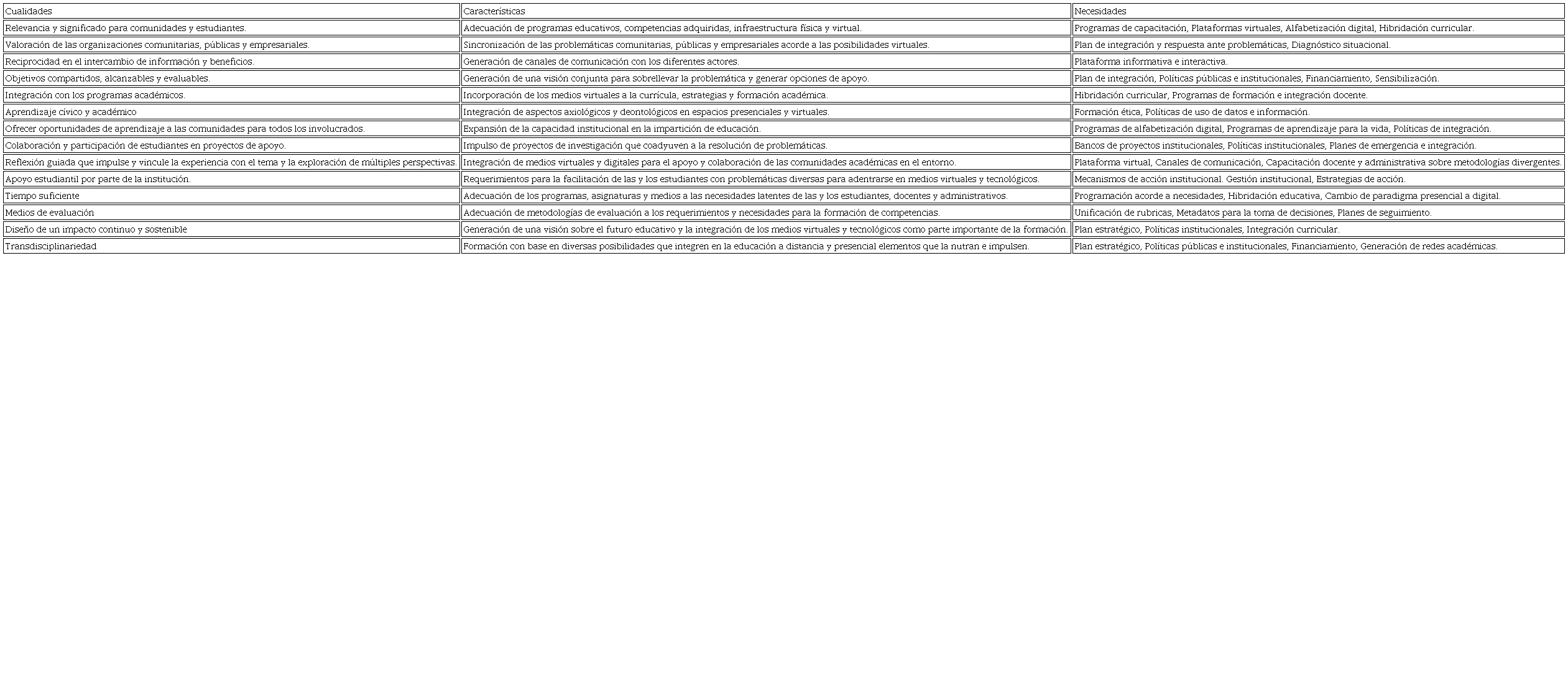 Ante esta situación tan inesperada, y como una parte elemental del proceso de adaptación y cambio, las IES deben tomar una serie de consideraciones que les permitan la realización de un análisis situacional que logre un panorama más certero respecto a las circunstancias producidas. Dentro de ellas se destacan: a) factores pedagógicos respecto a la manera de fomentar la praxis en ambientes virtuales, b) desarrollar estructuras curriculares que abarquen las necesidades psicopedagógicas de los programas, c) el acompañamiento de sistemas epistemológicos con los cuales sustentar el conocimiento generado y su aplicación, y d) la formación de espacios administrativos que fomenten el desarrollo de una base de servicios educativos en una perspectiva ya sea a distancia, semipresencial o híbrida (Rama, 2019). De ello se puede desprender una serie de cualidades específicas que Preradovic y Stark (2019) señalan como básicas para realizar un modelo pedagógico integral para el impulso al cambio en los ambientes virtuales y que se puede apreciar en el siguiente cuadro: