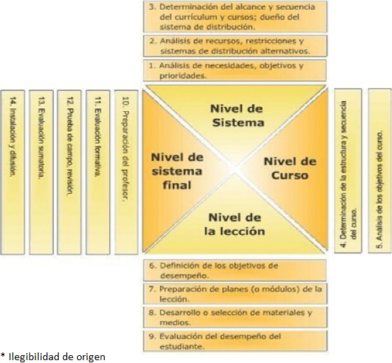 El modelo de Gagné y Briggs (Figura 1) se divide en cuatro niveles: 1. Nivel de sistema, 2. Nivel de curso, 3. Nivel de lección y 4. Nivel de sistema final (ITSON, s/f), que integran los 14 pasos que contiene y que describiremos a continuación: