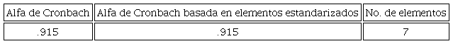 Finalmente, en la Tabla 11 se presentan los datos de confiabilidad a partir de la aplicación del instrumento a la muestra participante. Puede observarse que el instrumento presenta alta confiabilidad dado que el Alfa de Cronbach fue de 0.915 con p<0.05.