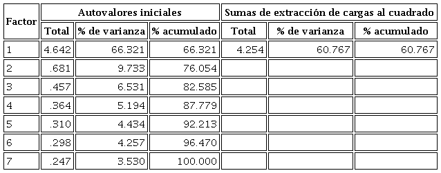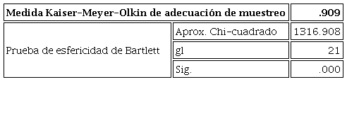 Como se mencionó anteriormente, a partir del grupo en estudio se analizó la validez de constructo y la confiabilidad del instrumento. En primer lugar, se presentan los resultados del análisis factorial, en la Tabla 6 se encontró que cumple los requisitos para el análisis factorial exploratorio: el valor de la determinante de la matriz de correlaciones fue de .012; la prueba de Bartlett fue de Xi: 1316.908 (p<0.001) y el Índice KMO de .909, que de acuerdo con Lloret, Ferreres, Hernández y Tomás (2014) se considera satisfactorio cuando son valores de .80 en adelante.
