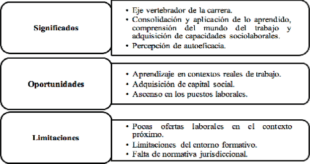 Con respecto a las limitaciones, todos señalan en primer lugar el contexto, tanto en lo que se refiere a la poca diversidad de lugares para hacer las prácticas como en cuanto a la distancia (los estudiantes de los parajes o municipios cercanos, en algunos casos no disponen de transporte público o, si existe, no coinciden con los horarios de la institución). Florez, Luraschi y Butti (2017) encontraron resultados similares respecto a las PP vinculadas al sector forestal y al sector construcciones en la región.