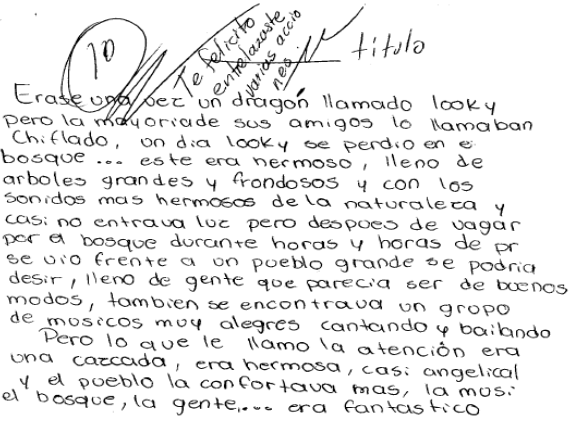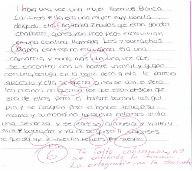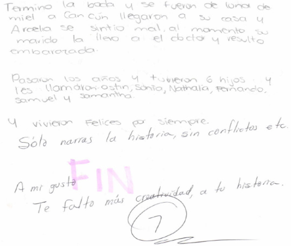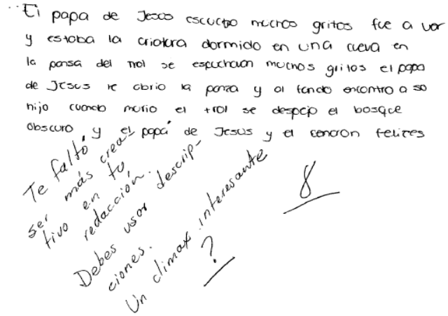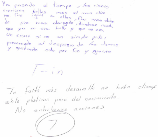 En cuatro de los 10 trabajos con las calificaciones más altas se encontraron notas escritas que enfatizan aquello que no hicieron los estudiantes, por ejemplo: “En momentos perdiste la coherencia de la trama. Pero te felicito”. El comentario señala una limitación, aunque de forma imprecisa, no hay un señalamiento de la manera en que la coherencia no estuvo presente. En seis de los textos que obtuvieron un 8 también se encontraron comentarios de este tipo, sin embargo, en este grupo de trabajos se detectaron dos que contenían notas escritas con potencial de orientar a los alumnos a la mejora, por ejemplo: “Debes usar sinónimos y así no repites la palabra”. En los 11 trabajos con las calificaciones más bajas (6 y 7), únicamente se incluyeron comentarios que señalan los errores de los estudiantes. En la siguiente imagen se observa que la docente apunta que en la narración “faltó más creatividad” y no había “conflicto”. Estos comentarios no dan información que pueda retomar el alumno para su mejora, por ejemplo, la manera en la que se podría haber construido un conflicto o la forma en que se manifiesta la creatividad en el texto.