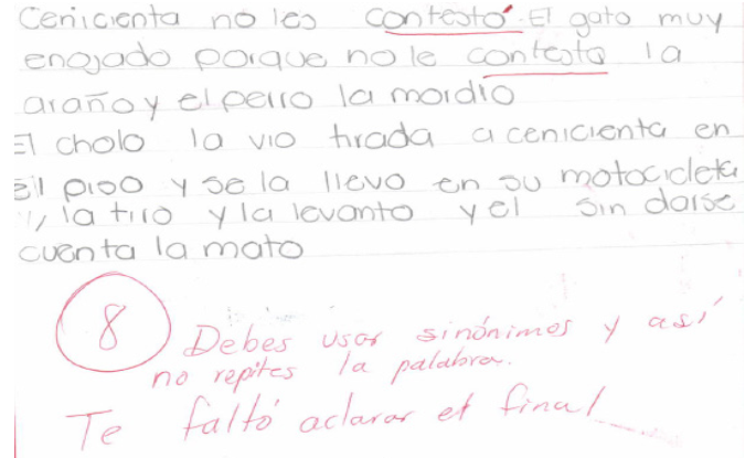 Es importante señalar que no se encontraron comentarios que ofrecieran a los estudiantes un contraste entre su desempeño actual y los objetivos de aprendizaje de la consigna, ni estrategias para cerrar la brecha entre ambos, sin embargo, se detectaron dos notas que brindan algunas orientaciones al trabajo de los estudiantes. Por ejemplo: “Repites las mismas palabras, busca sinónimos”, “Debes usar sinónimos y así no repites la palabra”. En los textos en los que se encontraron estos comentarios, también se identificaron marcas gráficas que indican algunas de las palabras que fueron repetidas, lo que podría brindar información útil a los alumnos para identificar en qué parte de su trabajo necesitan hacer estas modificaciones.