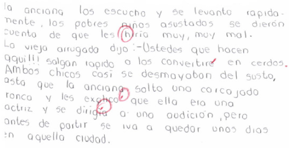 Las palabras encerradas en círculos parecen indicar algún error ortográfico. En algunos casos la profesora circuló la parte del vocablo en la que se encontraba el error, lo que podría brindar pistas a los alumnos para detectar sus áreas de oportunidad y hacer las modificaciones pertinentes, aunque la práctica que prevaleció fue que la docente corrigió las palabras colocando los acentos faltantes o la grafía correspondiente; esto se observó en 22 de los textos. La corrección de los errores por los docentes puede limitar el potencial de la retroalimentación para promover la búsqueda de soluciones por parte de los alumnos, pues en la literatura científica se ha encontrado que proveer una respuesta correcta evita que los estudiantes reflexionen sobre sus equivocaciones y no reduce la probabilidad de que los errores se repitan en el futuro (Elliot et al., 2016).
