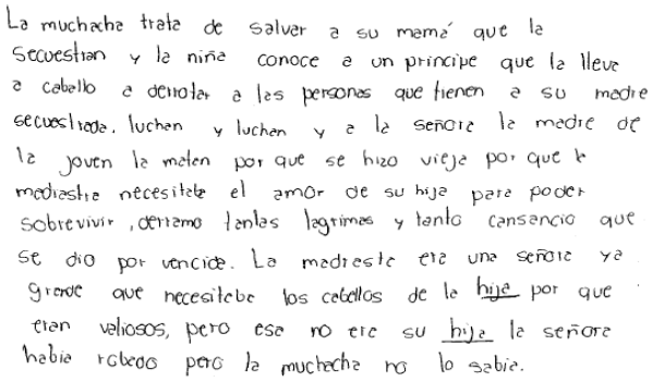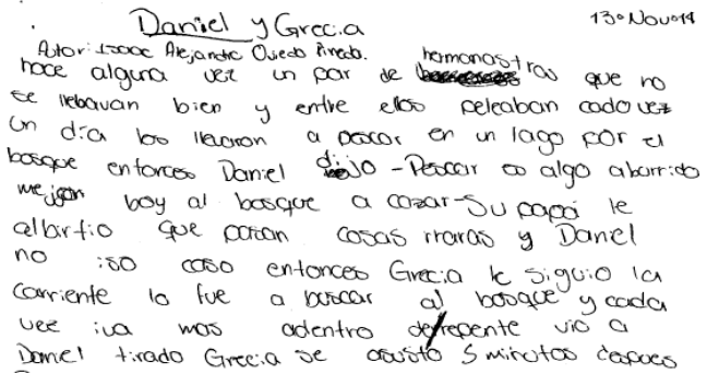 Pues que le faltó más… como trama, así más… o sea, ir así de partes en partes con más emoción sobre mi cuento, yo así lo creo […] y de la ortografía, pues igual como dice ahí, pues igual no la chequé, porque sí tengo muchas… faltas de ortografía.